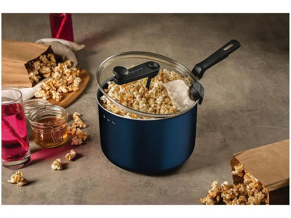 Diâmetro 20 cm e capacidade 3,5 litros garantindo pipoca seca e crocante