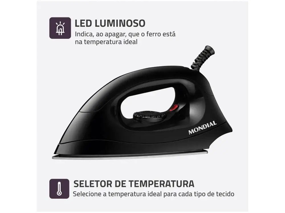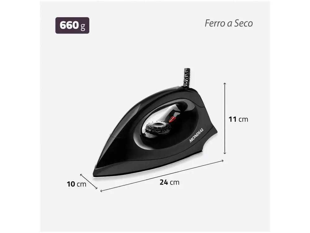 O ferro de passar seco FSN-55-B da Mondial facilita o seu dia a dia na hora de passar roupas. Possui design anatômico com base de alumínio polido, que garante distribuição uniforme do calor, e botões salientes ao longo da base, perfeitos para desamassar até as áreas mais difíceis, como entre os botões, colarinho e punhos.