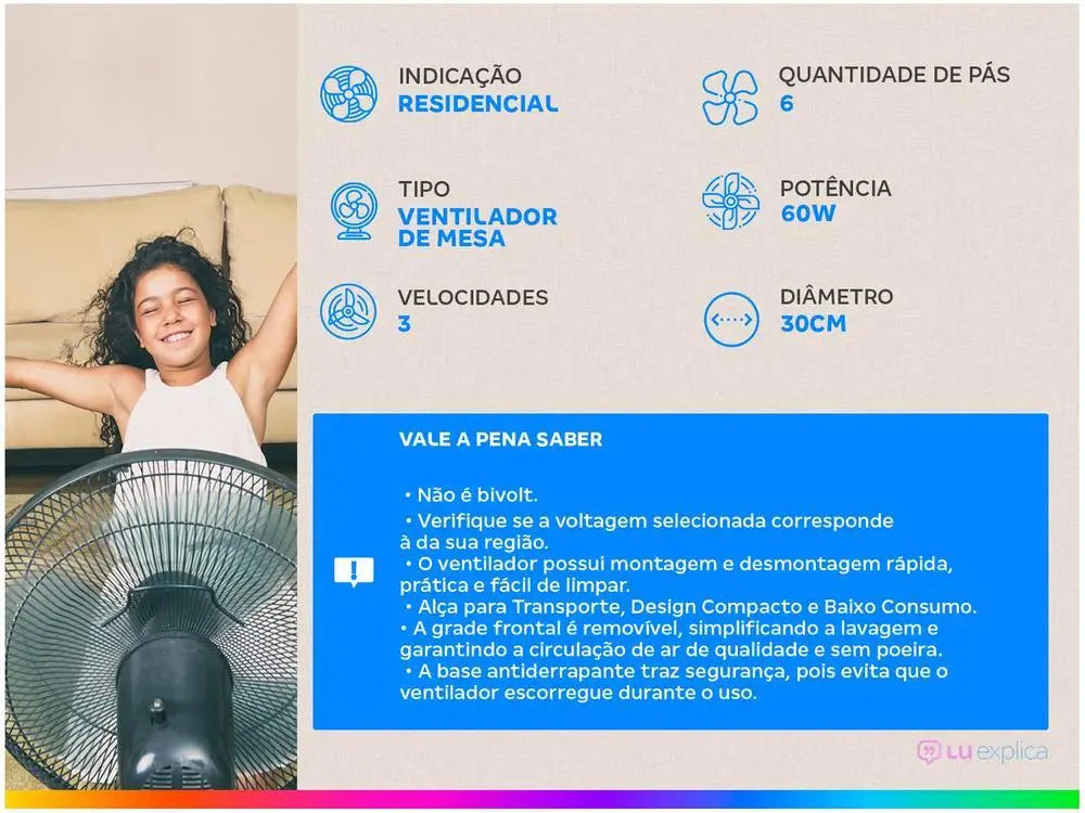 O Super Power VSP-30-W da Mondial é um ventilador de mesa com 3 velocidades, ideal para refrescar qualquer ambiente. Com hélice de 30 cm de diâmetro, é fácil de montar, eficiente e silencioso, garantindo conforto térmico sem incomodar com ruídos.