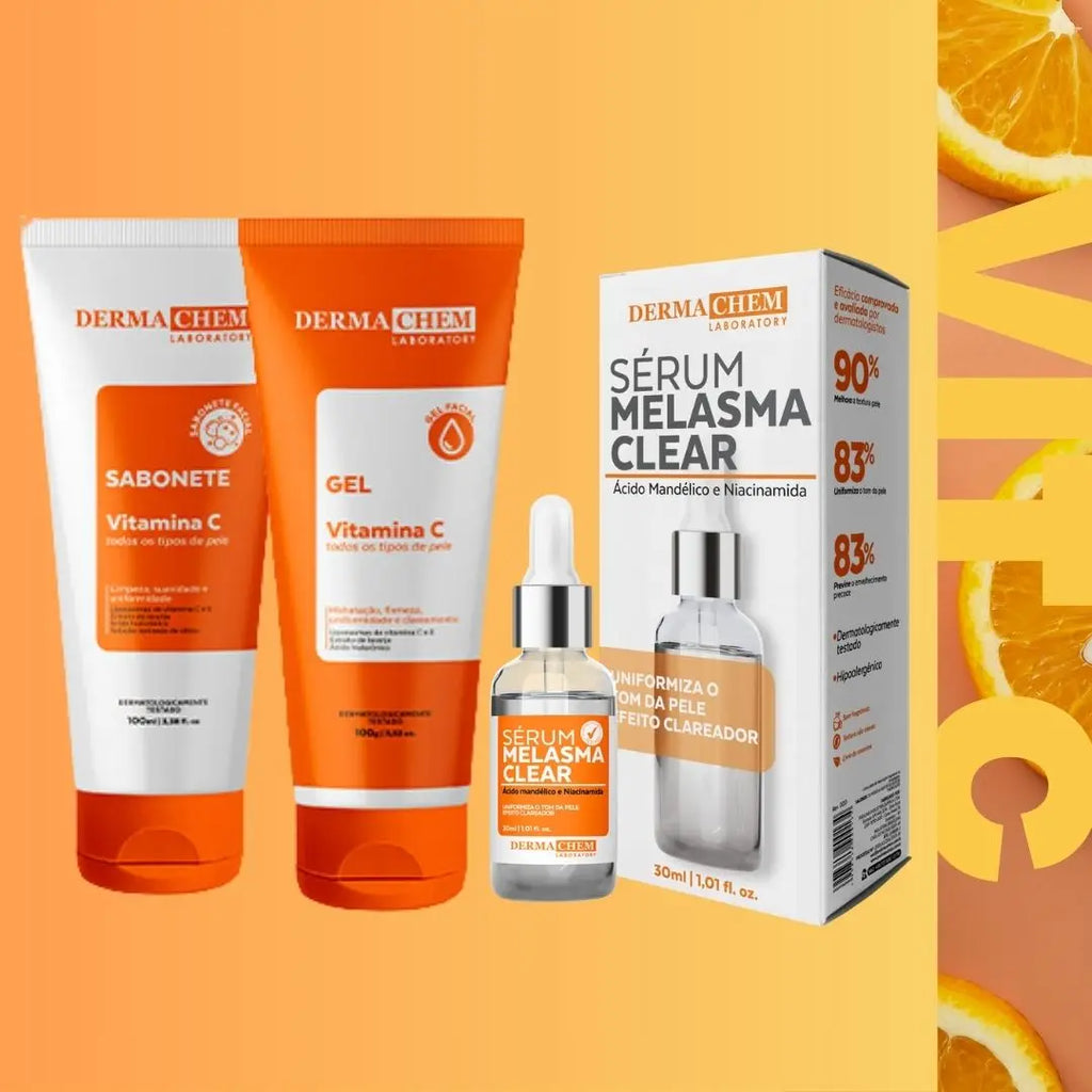 O Kit Skincare Vitamina C Dermachem é ideal para quem busca clareamento de manchas, hidratação e cuidados anti-idade. Composto por 3 itens essenciais: Clear Melasma Serum, Gel Facial Anti-Idade e Sabonete Facial com Vitamina C, proporciona rotina completa de cuidado para o rosto.